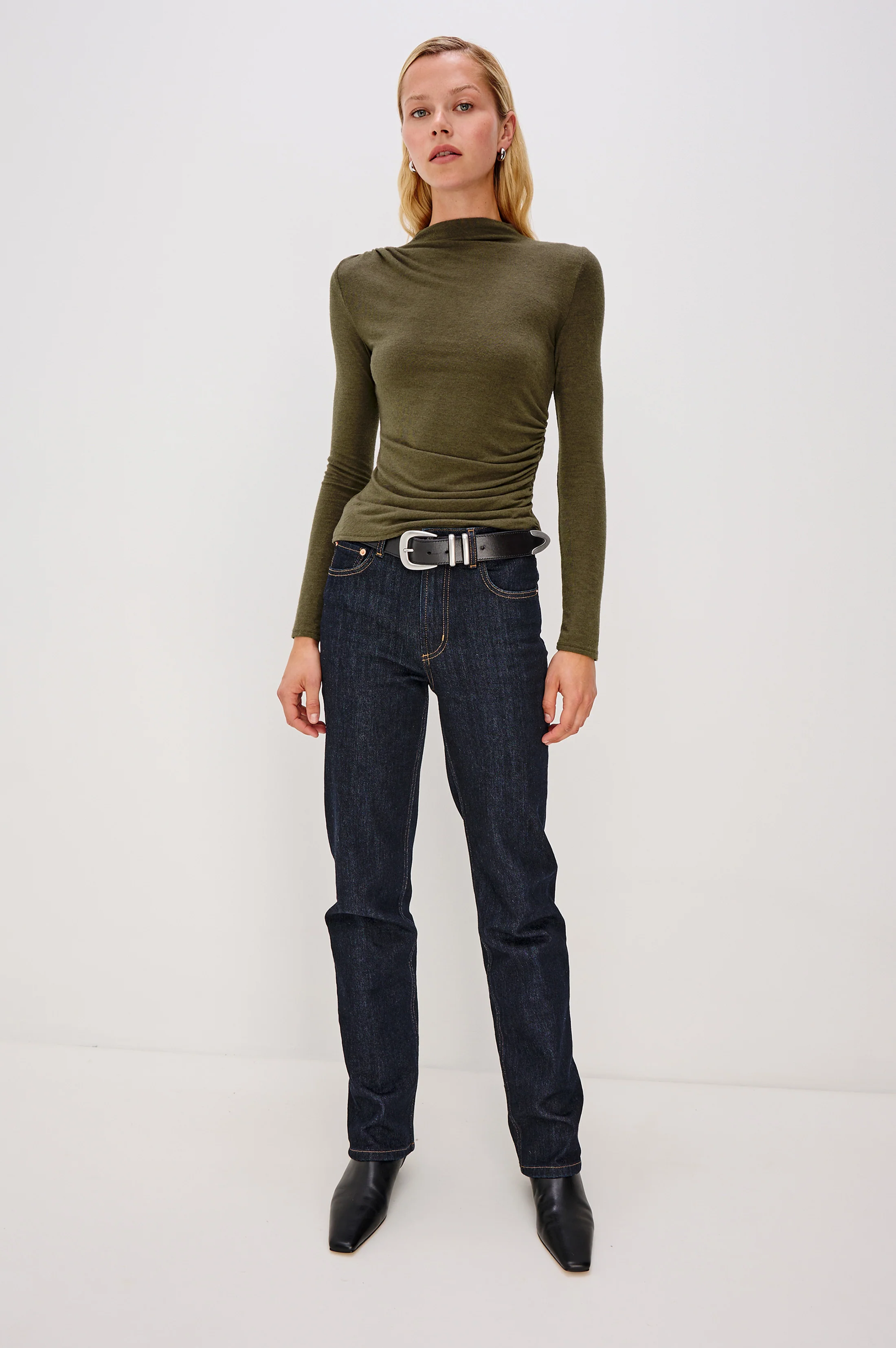A modern take on the classic long sleeve, the Joelle top is crafted from a soft gauge jersey with an asymmetrical mock neck with shirring details from the right shoulder.