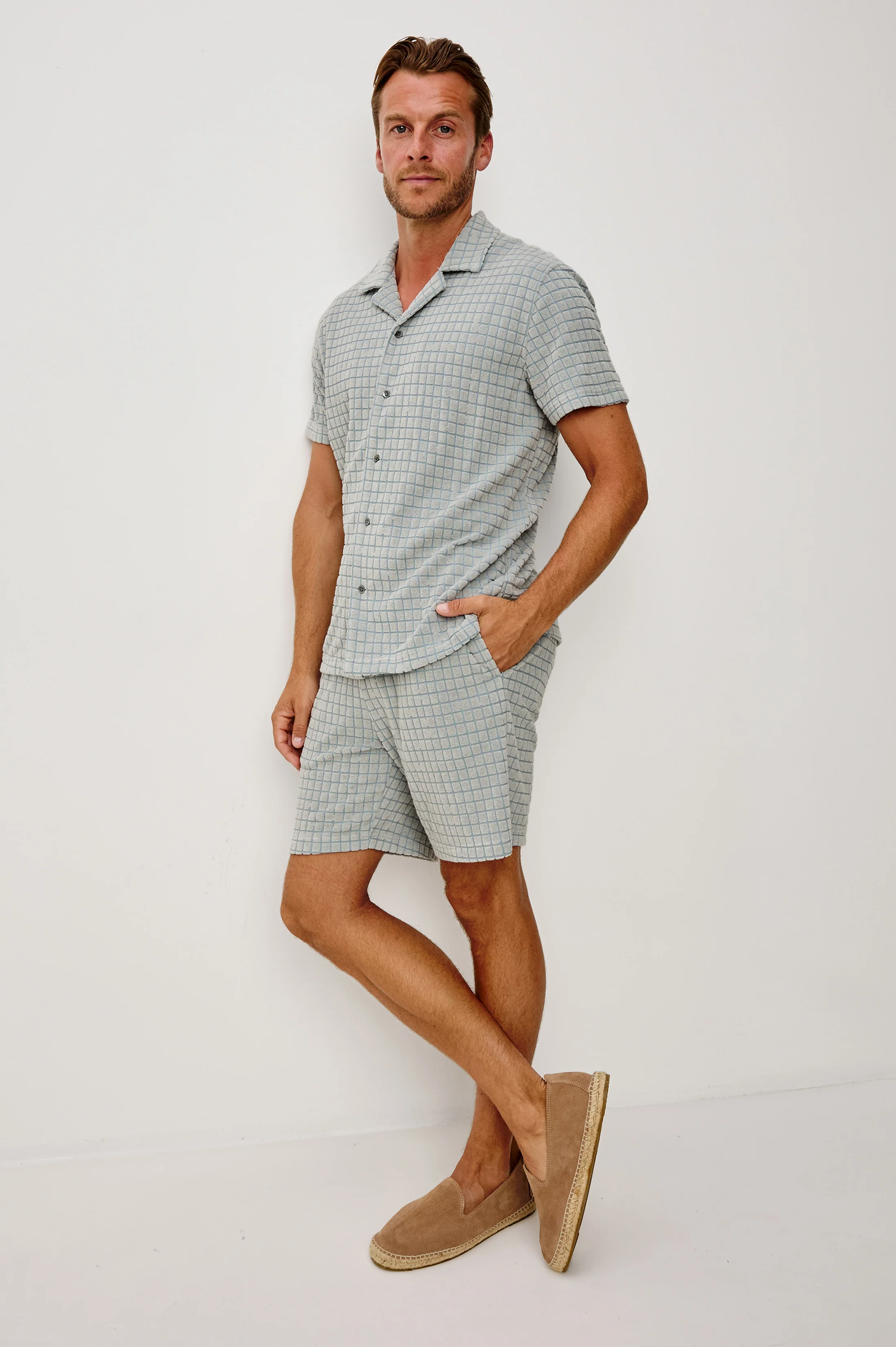 The Maverick Shirt is a classic short-sleeve, with a twist. Crafted from a unique towel terry fabric with a raised jacquard pattern, this button-down makes a statement on its own or paired with the matching Nova Short.